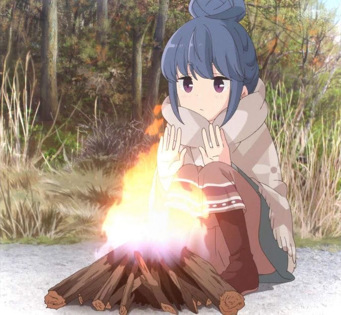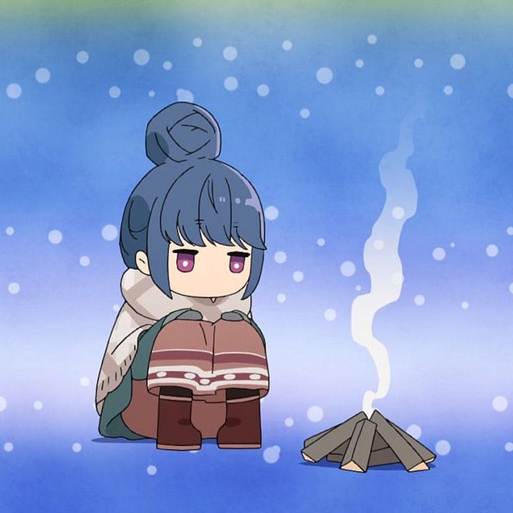 HOW I WISH I could request off time from work often enough to go on regular camping trips. At least once a season. Especially in the fall. Snow might be challenging but still fun. I used to go camping with my family during school breaks. It might be even better now that I’m an adult. For now, I’ll settle for episodes of Laidback Camp.
