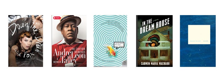 Down the Drain by Julia Fox | The Chiffon Trenches: A Memoir by Andre Leon Talley | I Am Not Myself These Days by Josh Kilmer-Purcell | In the Dream House by Carmen Maria Machado | Bluets by Maggie Nelson