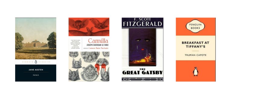 Emma by Jane Austen | Carmilla by J. Sheridan Le Fanu | The Great Gatsby by F. Scott Fitzgerald | Breakfast at Tiffany’s by Truman Capote