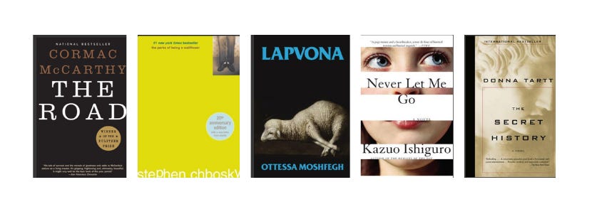 The Road by Cormac McCarthy | The Perks of Being a Wallflower by Stephen Chbosky | Lapvona by Ottessa Moshfegh | Never Let Me Go by Kazu Ishiguro | The Secret History by Donna Tartt